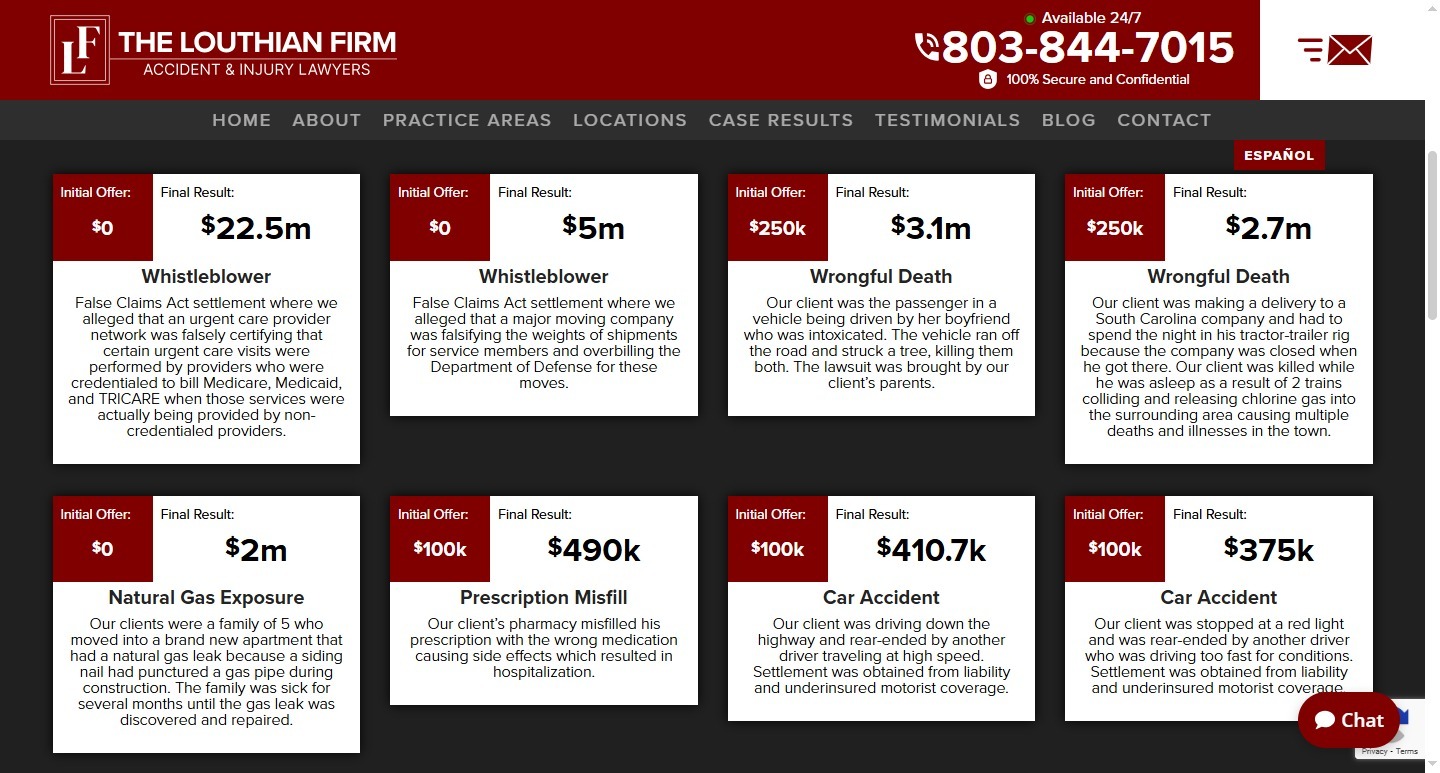 The homepage introduces the firm’s trusted local presence with a dynamic hero banner that highlights its core message — “Trusted Local Accident Attorneys Serving Columbia & Orangeburg SC.” The professional portrait of the lead attorney adds a personal, human touch that builds rapport with visitors from the first impression. Strong visual contrast—white text against deep black and red backgrounds—ensures maximum readability and engagement. Contact details, including a 24/7 phone number and chat support, are strategically positioned in the header for instant access. Throughout the site, testimonials and case results provide powerful social proof, showcasing multi-million dollar settlements that establish authority and inspire confidence. The layout maintains clarity across all devices, with responsive optimization that ensures clients can easily reach the firm whether they’re on desktop, tablet, or mobile.