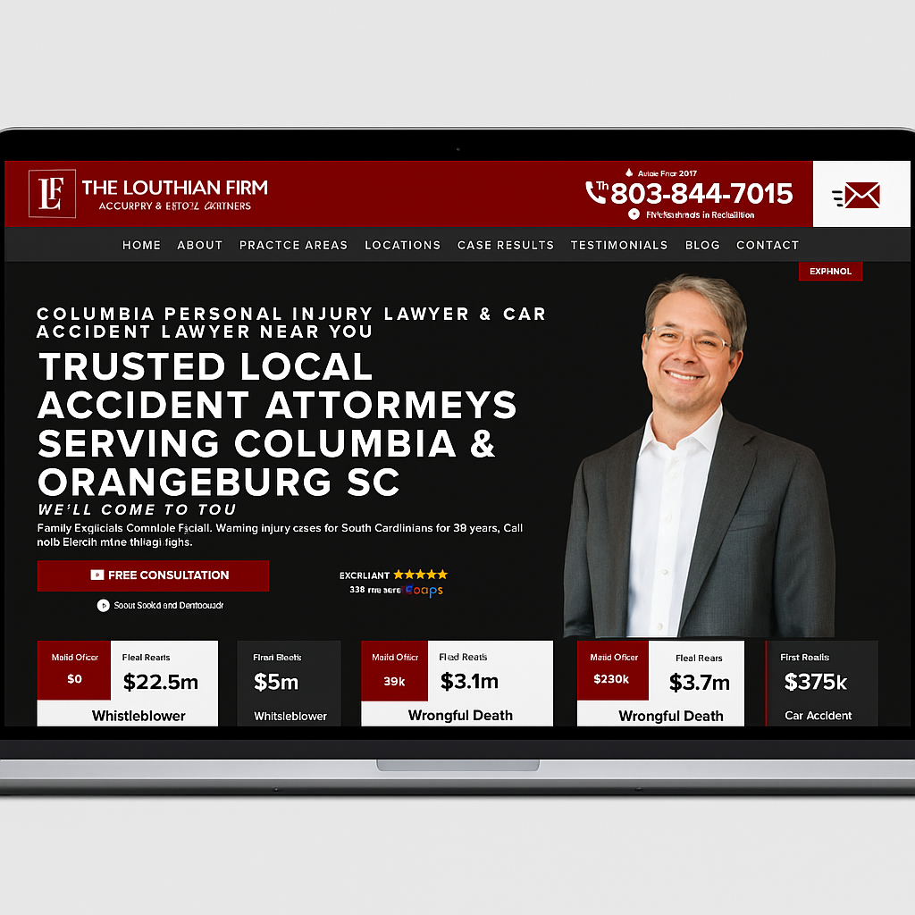 The Louthian Law Firm website was designed to project authority, trust, and approachability—qualities essential for a personal injury practice with over 35 years of service. Our goal was to create a high-impact digital presence that instantly communicates the firm’s credibility while simplifying how potential clients connect with their attorneys. The site’s structure emphasizes immediacy and reassurance. Clear typography, bold headlines, and a strong visual hierarchy guide users from discovery to consultation in seconds. A consistent “Free Consultation” call-to-action is visible across every page, reinforcing accessibility and inviting user interaction. Built on best practices for legal SEO, the site ranks effectively for local and practice-specific keywords, helping the firm stand out in a competitive South Carolina legal market.