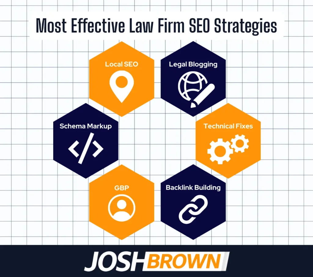 The most effective law firm SEO strategies include targeting local searches, publishing legal blogs, fixing technical issues, building quality backlink and brand mentions , optimizing Google Business Profiles, and applying structured schema.
