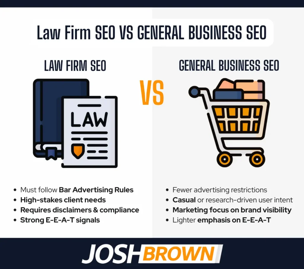 Law firm SEO differs from general business SEO in terms of strict ethics, content precision, and user urgency. Legal SEO follows professional advertising standards set by state bar associations, requiring disclaimers and barring misleading claims, unlike broader promotional business SEO. User intent in legal SEO reflects high-stakes, urgent searches for legal help, compared to casual product or service research in other industries.
