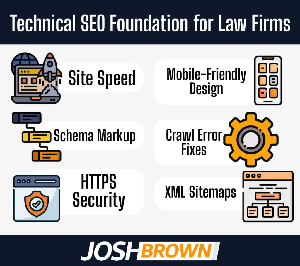 A law firm builds a technical SEO strategy to strengthen site speed, mobile-friendliness, schema markup, crawl error fixes, HTTPS Security, XML Sitemaps, and align with ranking factors.