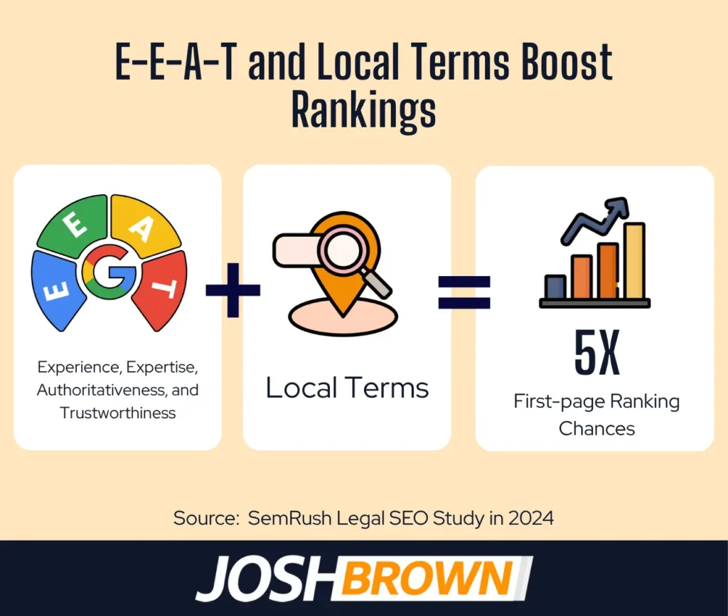 - Follow E-E-A-T Principles: Build content that reflects experience, expertise, authority, and trust with attorney bios and client case studies.