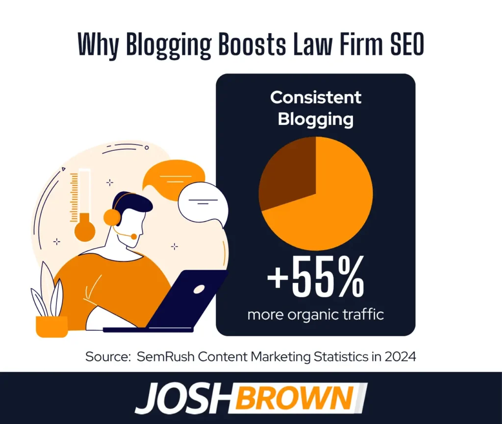 For example, a 2024 Semrush study indicated that consistent blogging increases indexed pages by up to 434% and inbound links by 97% compared to firms without blogs. This expansion of organic reach and authority supports lawyer lead generation and visibility in search results.