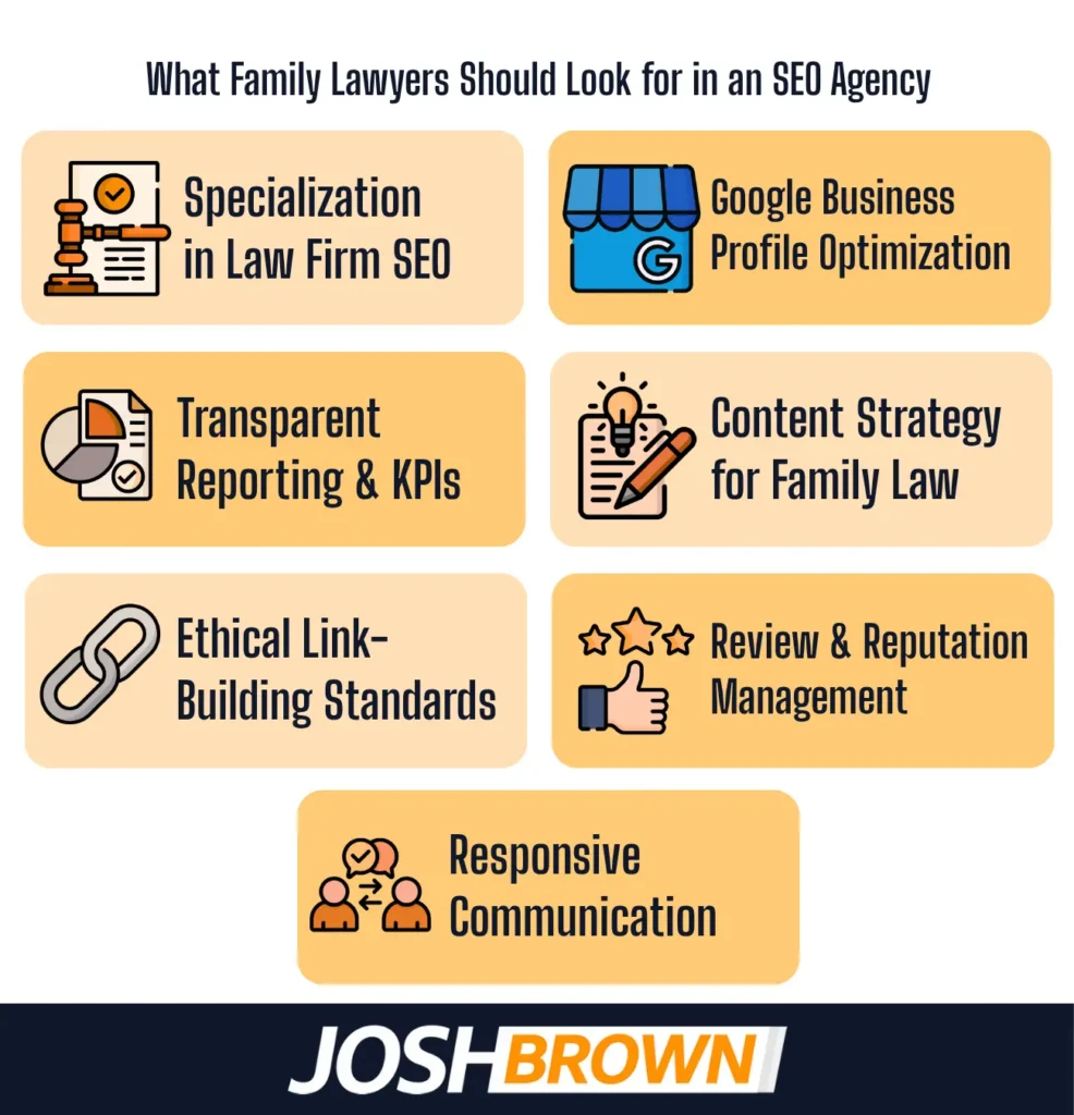 In an SEO agency, family lawyers should prioritize legal niche expertise, transparency, and ethical strategies to ensure trust-building visibility and long-term ranking success. These qualities help align SEO performance with the emotionally sensitive and high-intent nature of family law searches.