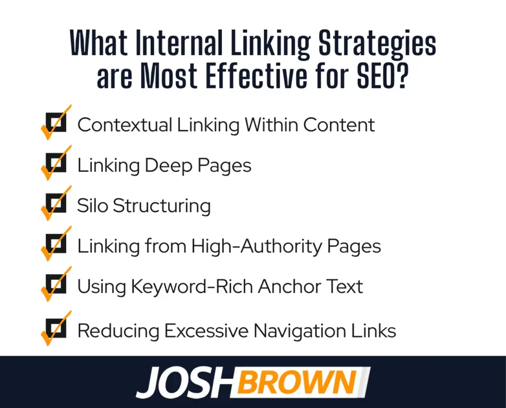 Internal linking strategies are most effective for SEO when they improve Contextual linking within content, linking deep pages, Silo structuring, linking from high-authority pages, and clarifying site structure. Strong internal link tactics help search engines index deep content and understand topical relevance.