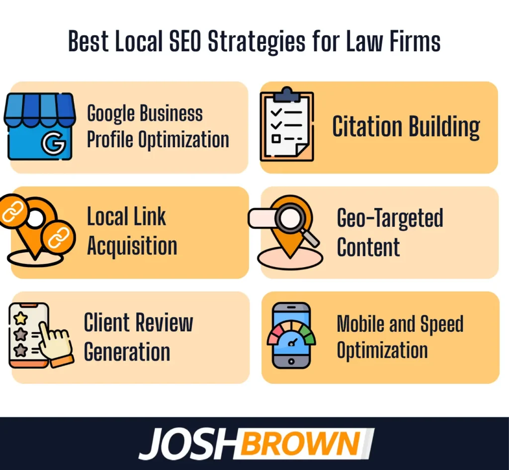 The best local SEO strategy for law firms is optimizing the Google Business Profile (GBP), building citations, earning local backlinks, and creating geo-targeted content to dominate local search results and Google Maps visibility.