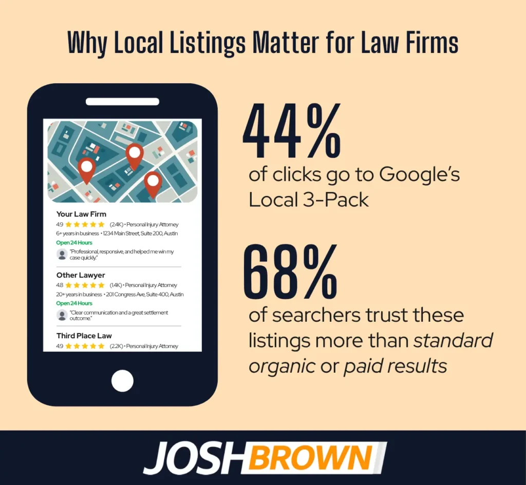 Local listings matter for law firm SEO and Google visibility because they drive the majority of client interactions through maps and local search results. Businesses featured in Google’s Local 3‑Pack receive approximately 44% of clicks and build trust with 68% of searchers, compared to much lower engagement from organic or paid listings.