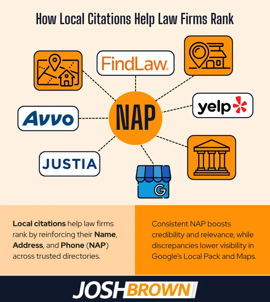 Local business citations help law firms rank by reinforcing their Name, Address, and Phone number (NAP) across trusted directories and platforms, which boosts credibility and location-based relevance in Google’s local algorithm. These citations act as signals of trust and consistency when your law firm’s information is accurately listed across sites like Justia, Avvo, FindLaw, Yelp, and local chambers of commerce, it validates the business’s legitimacy and geographic relevance to search engines.