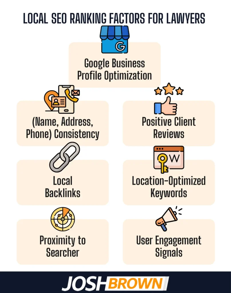 Local SEO ranking factors for lawyers on Google are Google business profile optimization, user engagement signals, and proximity to the specific signals Google uses to determine which law firms appear in the local pack and map results for legal searches.