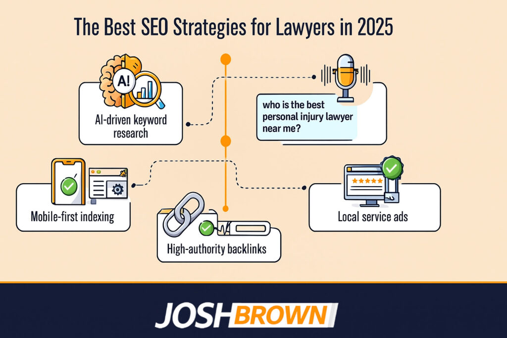 The best SEO strategies for lawyers in 2025 are AI-driven keyword research, voice search optimization, mobile-first indexing, and local service ads.