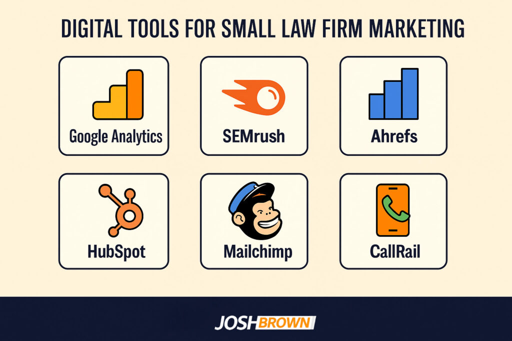 Digital tools for small law firm marketing are Google Analytics, SEMrush, Ahrefs, HubSpot, and Mailchimp.