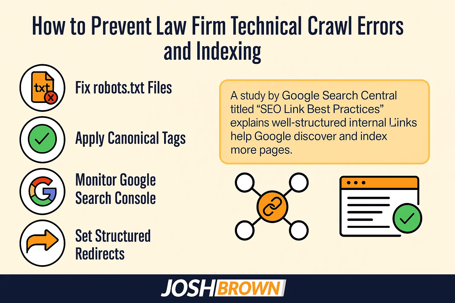 You can prevent law firm technical crawl errors and indexing issues by fixing robots.txt files, applying canonical tags correctly, monitoring Google Search Console, and setting structured redirects. These practices ensure that search engines crawl and index the right pages without duplication or blockages.