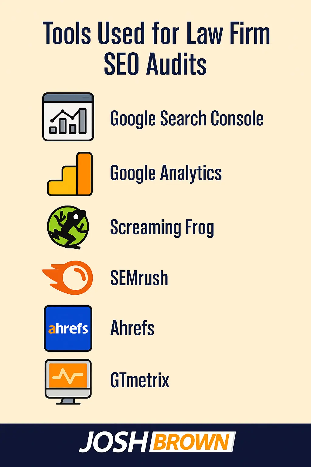 Tools used for law firm SEO audits include Google Search Console, Google Analytics, Screaming Frog, and SEMrush.
