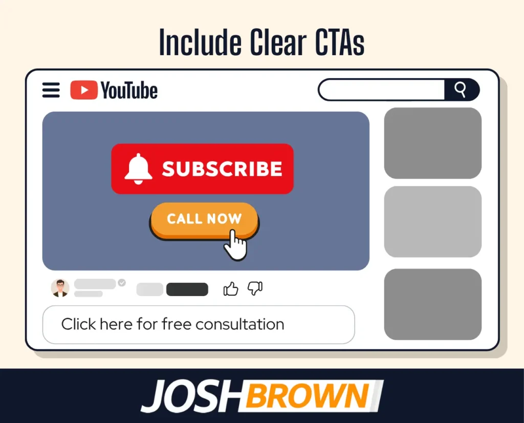 Clear calls-to-action (CTAs) guide viewers to act, subscribe, contact the firm, or visit the website. Effective CTAs must appear verbally and visually in the video, in the description, and as end screen elements. Use action verbs tied to legal services, such as “Call now,” “Book a consult,” or “Watch next.” Strategic CTAs increase user engagement, lead conversion, and channel retention.