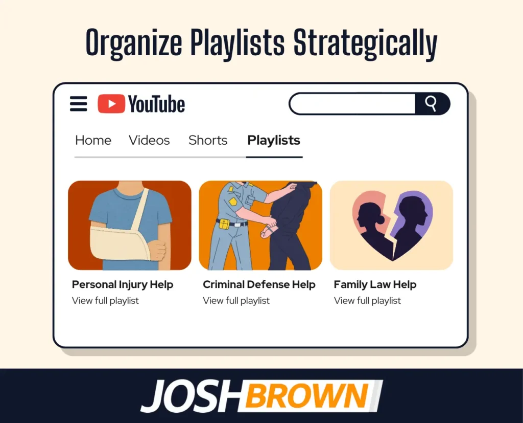 Strategically organized playlists boost channel authority, session duration, and topical depth. Grouping videos by practice area (e.g., personal injury, estate law) or content type (e.g., FAQ, testimonials) allows YouTube to associate your channel with specific topics. Order playlists based on user journey, use keyword-rich titles, and enable autoplay to maintain viewer flow.