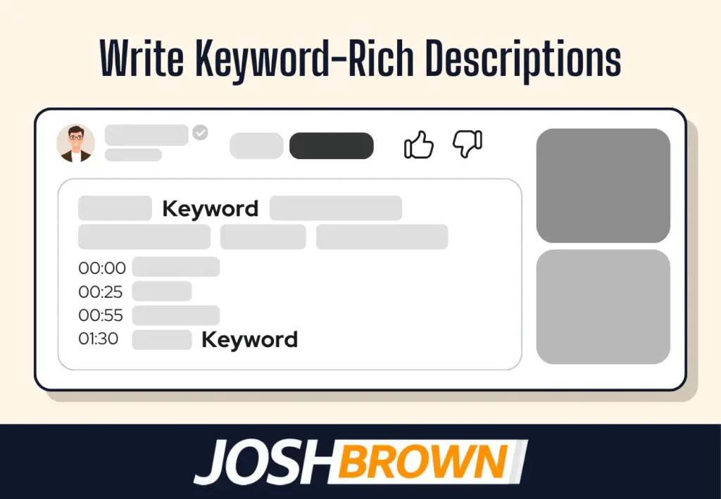 Keyword-rich descriptions help YouTube and Google understand the video’s topic for indexing and ranking. A good description includes your target keywords within the first two sentences, followed by supporting context, legal terms, and local SEO phrases. Descriptions must be at least 250 words and include links to your website or social profiles. Proper formatting with bullet points and time stamps enhances user experience and discoverability.